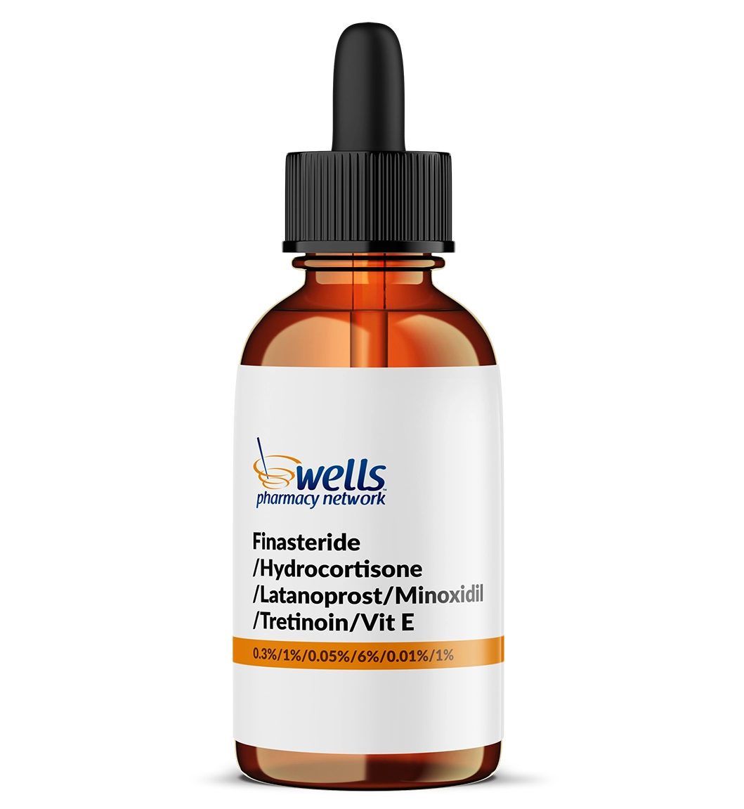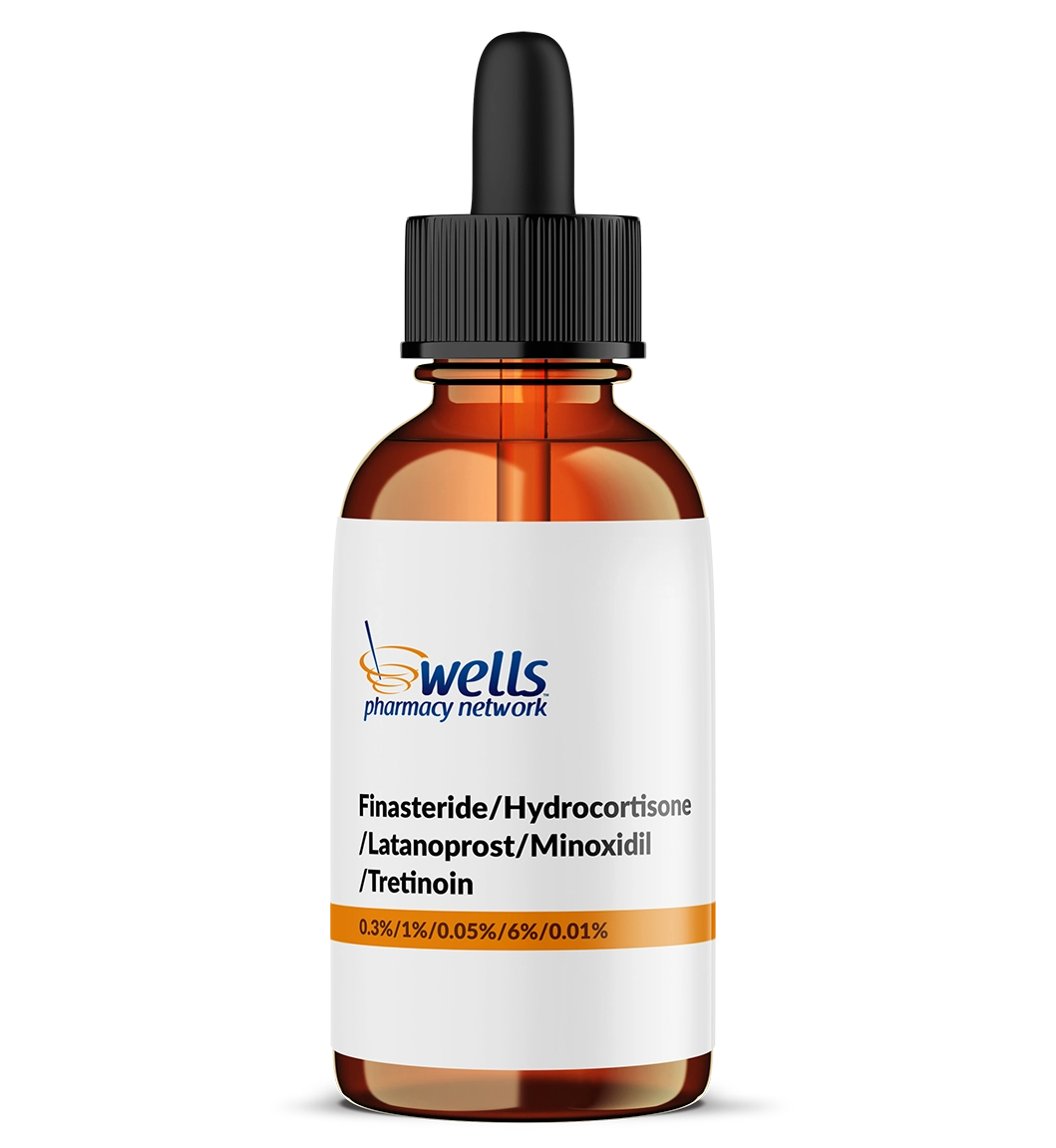 This topical formulation for women combines finasteride, hydrocortisone, latanoprost, minoxidil, tretinoin and vitamin E together to target multiple pathways of hair loss by promoting follicle stimulation, reducing inflammation, and enhancing absorption. Each drug has a unique mechanism of action to support development and growth of hair. Designed for alopecia, it may support hair regrowth, scalp health, and improved hair density with consistent use.